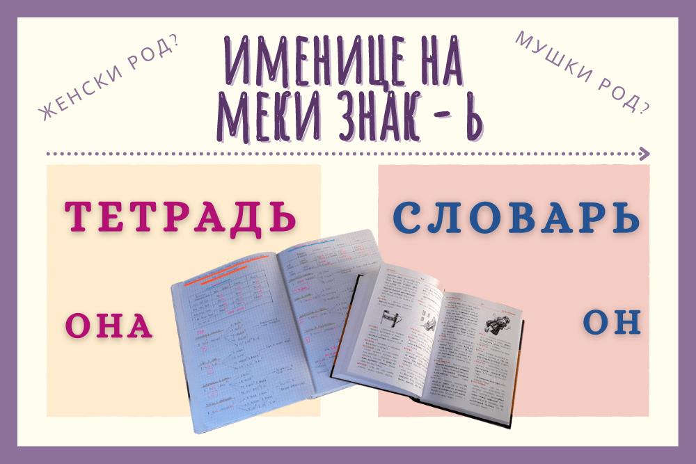 Преведена на српски језик реченица гласи: Ово су моја свеска и мој речник. Обратите пажњу на именице свеска ( на руском језику тетрадь) и речник ( на руском језику словарь). Приметиће да се наведене именице, без обзира на исто слово на крају речи, разликују у роду – свеска припада именицама женског а речник именицама мушког рода.